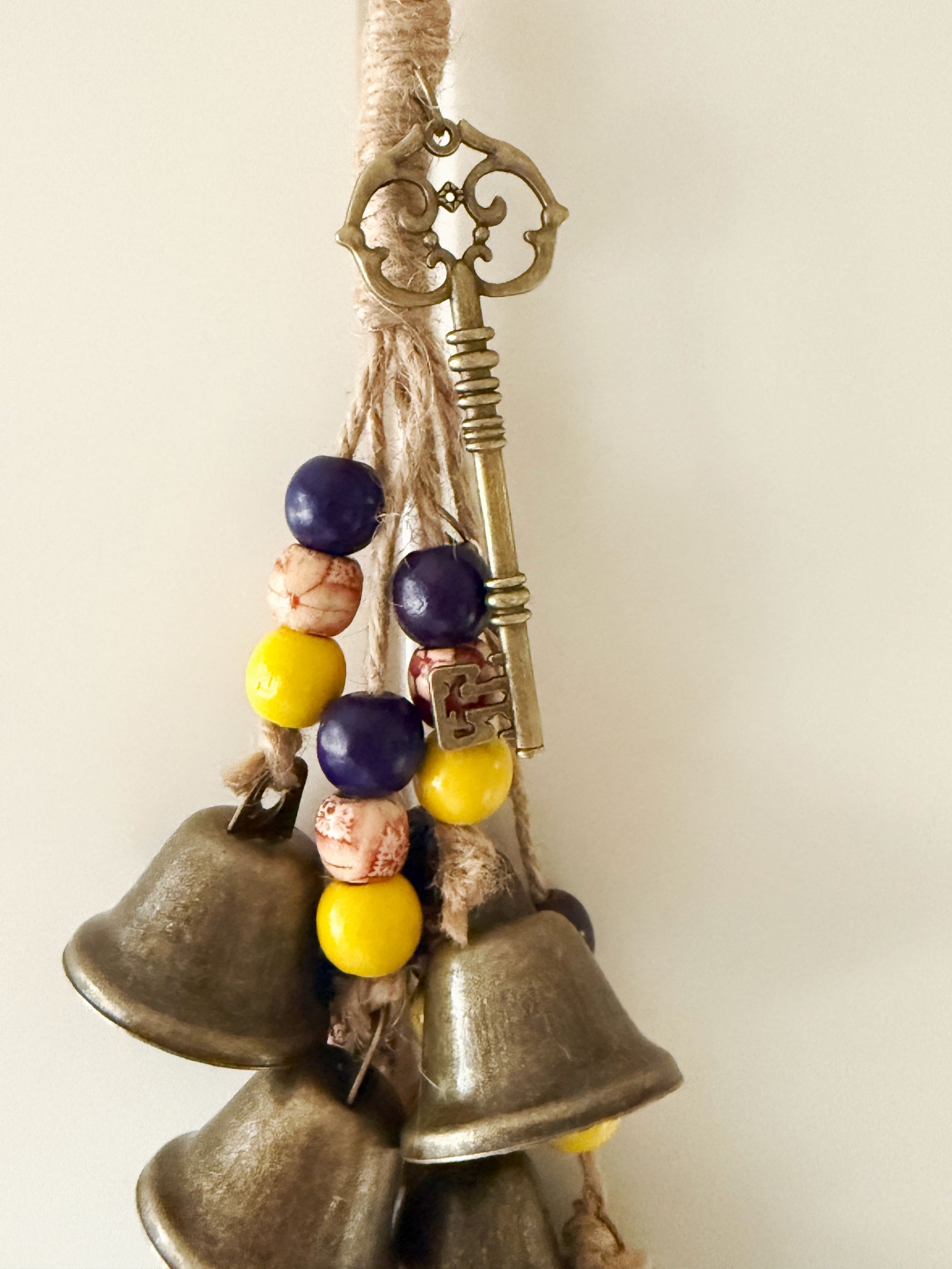 Découvrez ce carillon éolien unique qui marie harmonieusement tradition et fantaisie. Avec sa clé vintage en bronze, ses perles colorées en bois éclatantes (jaune vif, violet profond et marbrées marron) et ses délicates clochettes en métal, cette pièce apporte une touche poétique et joyeuse à votre intérieur ou extérieur.